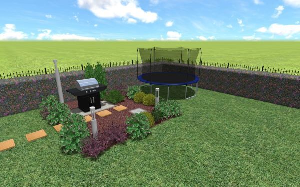 Studio in 3D per nuvo giardino e piccola area barbecue e gioco
